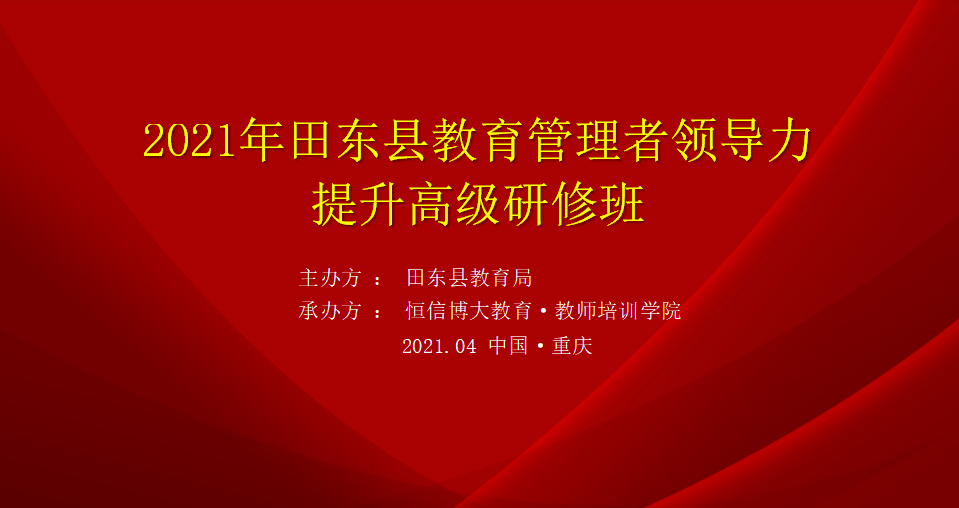 为落实田东县2021年教育工作重点,推进“学习提升、精细化管理”活动扎实开展,进一步提升教育系统管理者的综合素养和领导水平。4月20日—26日,为期一周的2021年田东县教育管理者领导力提升高级研修班在重庆举办,特邀教育部原督导局副局长、国家督学林仕梁(正司级),重庆市教育科学研究院党委委员、副院长万礼修,北京大学考试研究院理事、哈师大附中特级教师郭建民,广西高等教育学会基础学科教学专业委员会副主任、广西大学硕士生导师黄映恒博士作为研修班的培训导师,局机关股室负责人、业务骨干一行64人参加受训。