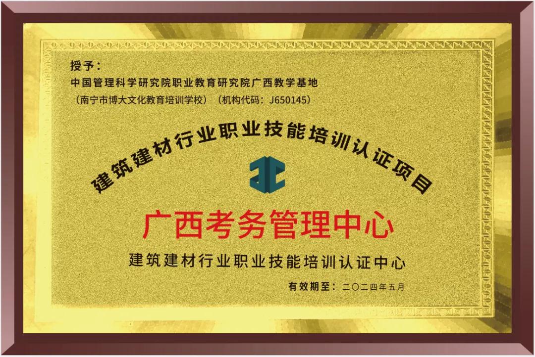 近日,国家建筑材料行业职业技能鉴定指导中心依据“建筑建材行业职业技能培训认证项目”实施有关规定,经审核,正式授权南宁市博大文化教育培训学校,在广西壮族自治区设立广西考务管理中心(机构代码:J650145)!