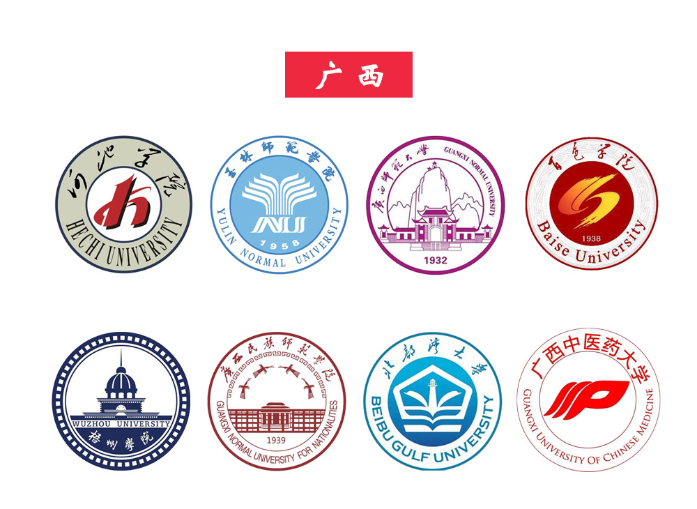 广西共8所,分别是:河池学院 、百色学院、玉林师范学院 、梧州学院、广西民族师范学院、北部湾大学、广西中医药大学、广西师范大学