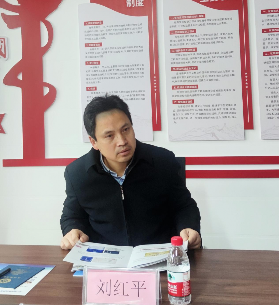 图二:陈经理向刘副馆长介绍公司党建及文化长廊
