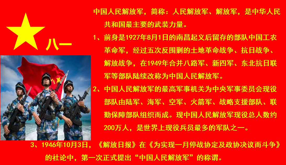1927年8月1日,南昌城头一声枪响,拉开了我们党武装反抗国民党反动派的大幕。自那时起,中国共产党领导下的人民军队,就英勇投身为中国人民求解放、求幸福,为中华民族谋独立、谋复兴的历史洪流,同中国人民和中华民族的命运紧紧连在了一起。95年来,人民军队历经硝烟战火,一路披荆斩棘,付出巨大牺牲,取得一个又一个辉煌胜利,为党和人民建立了伟大的历史功勋。