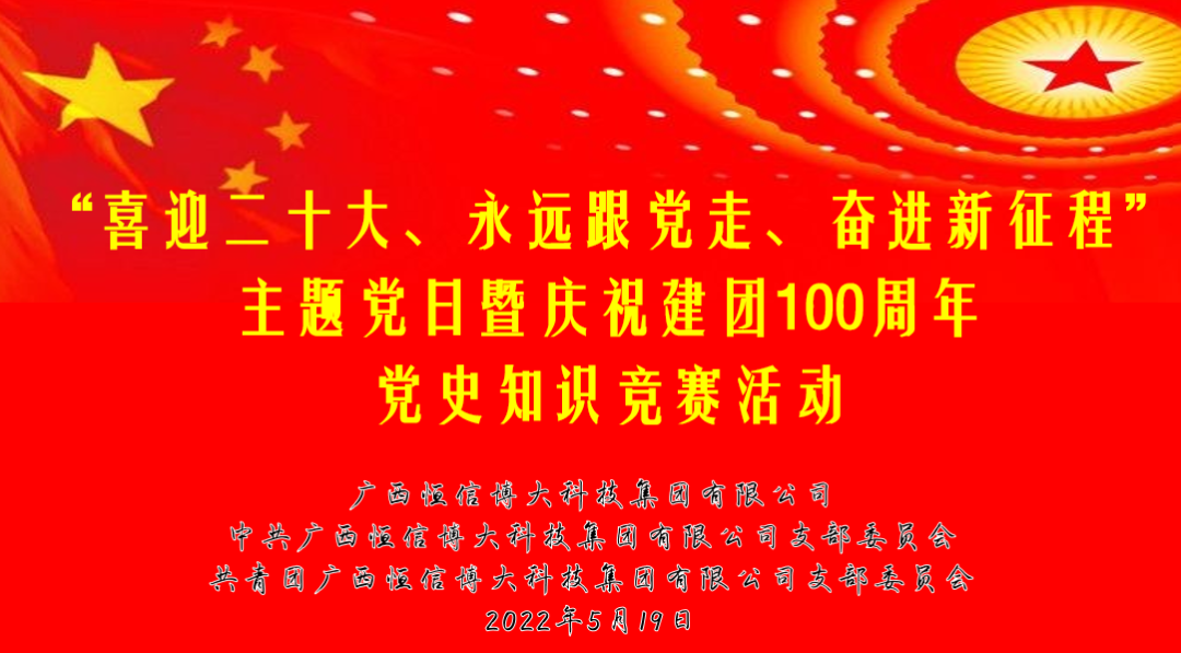 为促进公司党团员进一步学习党的基本知识,增强人民群众对党的认识,加强党团员思想政治教育,提高党团员自身政治理论素养,从而提高基层党团组织的凝聚力和战斗力,提高全体党团员的整体素质,体现党团员先锋模范带头作用以及党团员的先进性。2022年5月19日恒信博大党支部联合公司团支部在南宁总部成功举办“喜迎二十大、永远跟党走、奋力新征程”主题党日暨庆祝建团100周年党史知识竞赛活动。