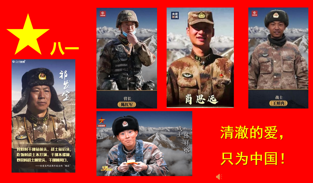 活动上,大家一起了解、学习中国人民解放军里的基本知识、学习卫国戍边英雄祁发宝、陈红军、陈祥榕、肖思远、王焯冉以及“八一勋章”获得者杜富国的英雄事迹,极大的鼓舞了大家要保家卫国的决心。