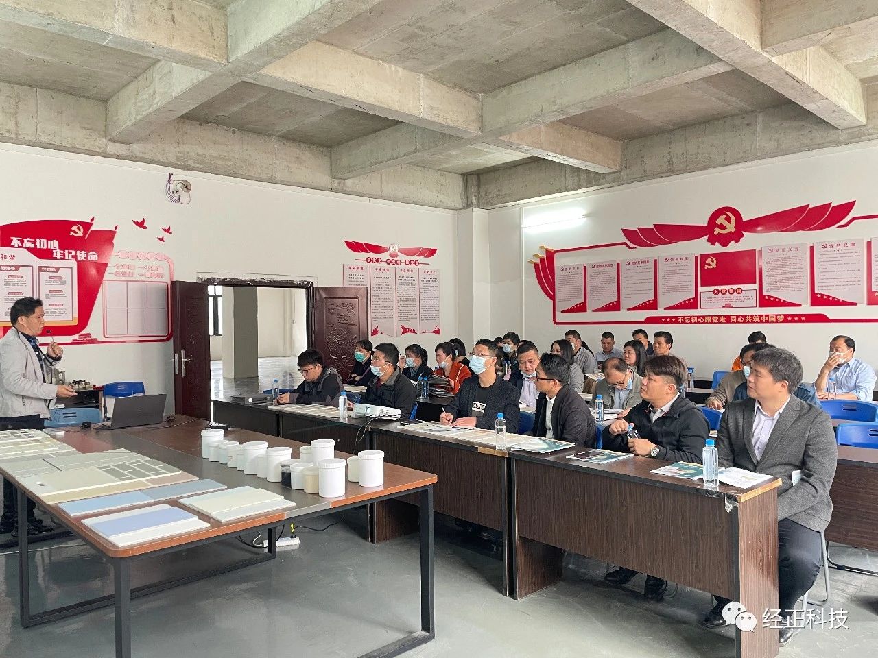 随后全体人员移步基地5楼党员活动室,进行涂料理论知识的培训,理论知识讲解过程中,公司技术总工程师通过样板、样板册及成品湿样的附带讲解,同时,引导同事们上讲台亲自触摸涂料样板、观察产品湿样,让同事们对涂料的理论知识有更高的接受度,也对公司产品的质量有更直观的认识。