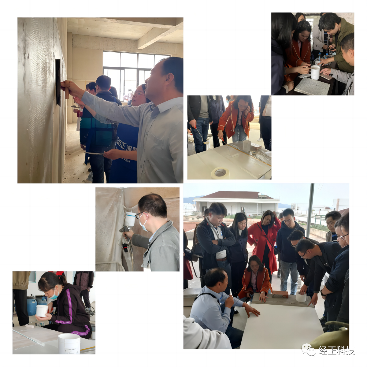 3月16日下午,进行的是涂料施工工艺实操,同事们亲自上手学习从基材抗裂砂浆批刮到各类产品喷涂/滚涂施工的全过程,也在实践过程中亲眼见证了公司无机涂料的防火阻燃性。