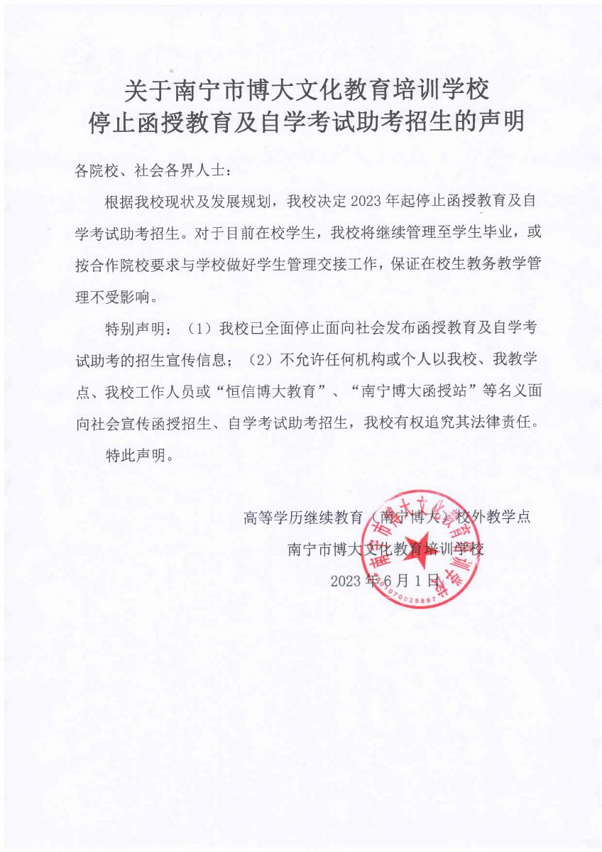 关于南宁市博大文化教育培训学校 停止函授教育及自学考试助考招生的声明,请知悉!