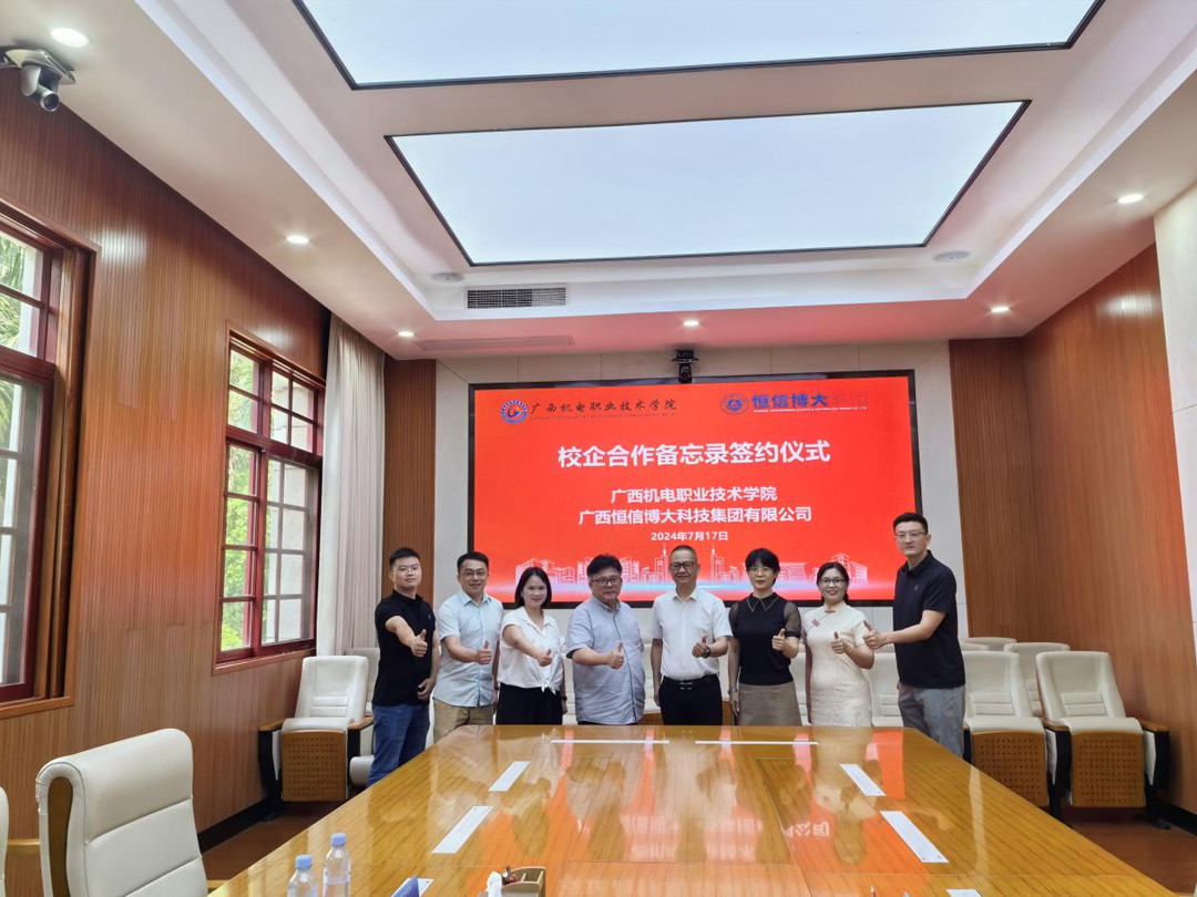 2024年7月17日上午,在公司董事长黄映恒博士、副总经理覃素芬的带领下,公司一行4人到达广西机电职业技术学院,出席校企合作备忘录签约仪式。广西机电职业技术学院出席签约仪式的有副校长刘捷、国际教育学院院长付瑶、国际合作交流科科长钟营和国际教育学院干事刘锴等4位代表。