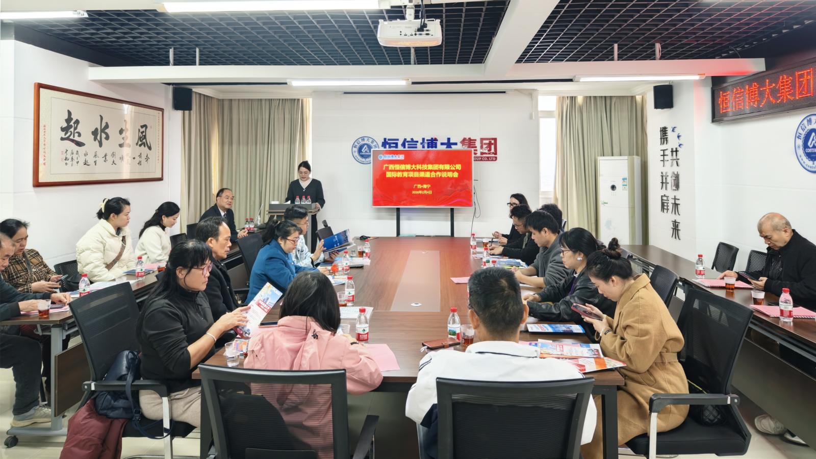 2026年02月04日,恰逢立春,万物复苏之际,广西恒信博大科技集团有限公司在财智时代大厦南宁总部会议室成功举办国际教育项目渠道合作说明会。本次会议以“共拓教育新机遇,携手合作赢未来”为主题,旨在与各界合作伙伴共商教育发展大计,共谱合作共赢新篇章。