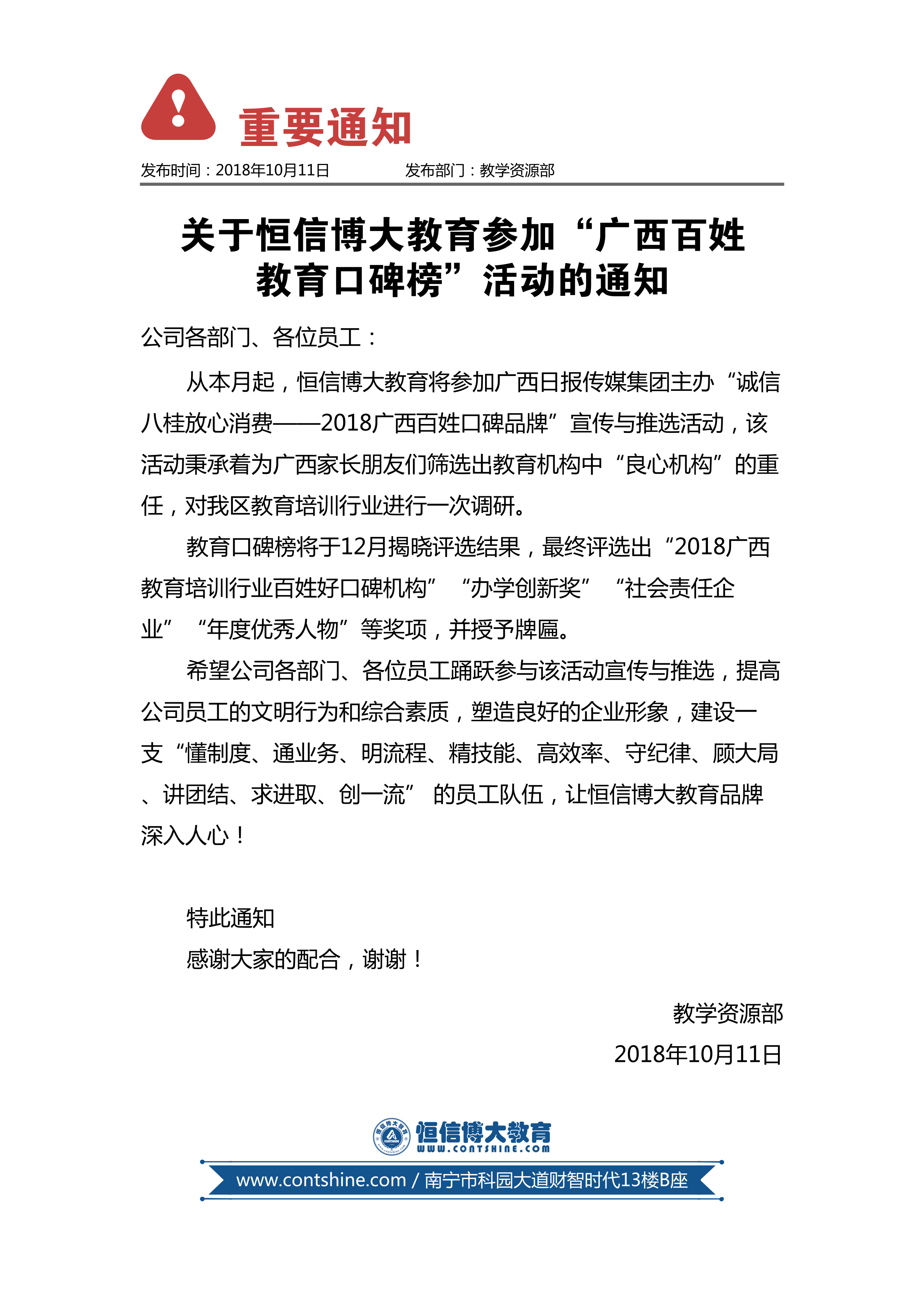 关于恒信博大教育参加“广西百姓教育口碑榜”活动的通知