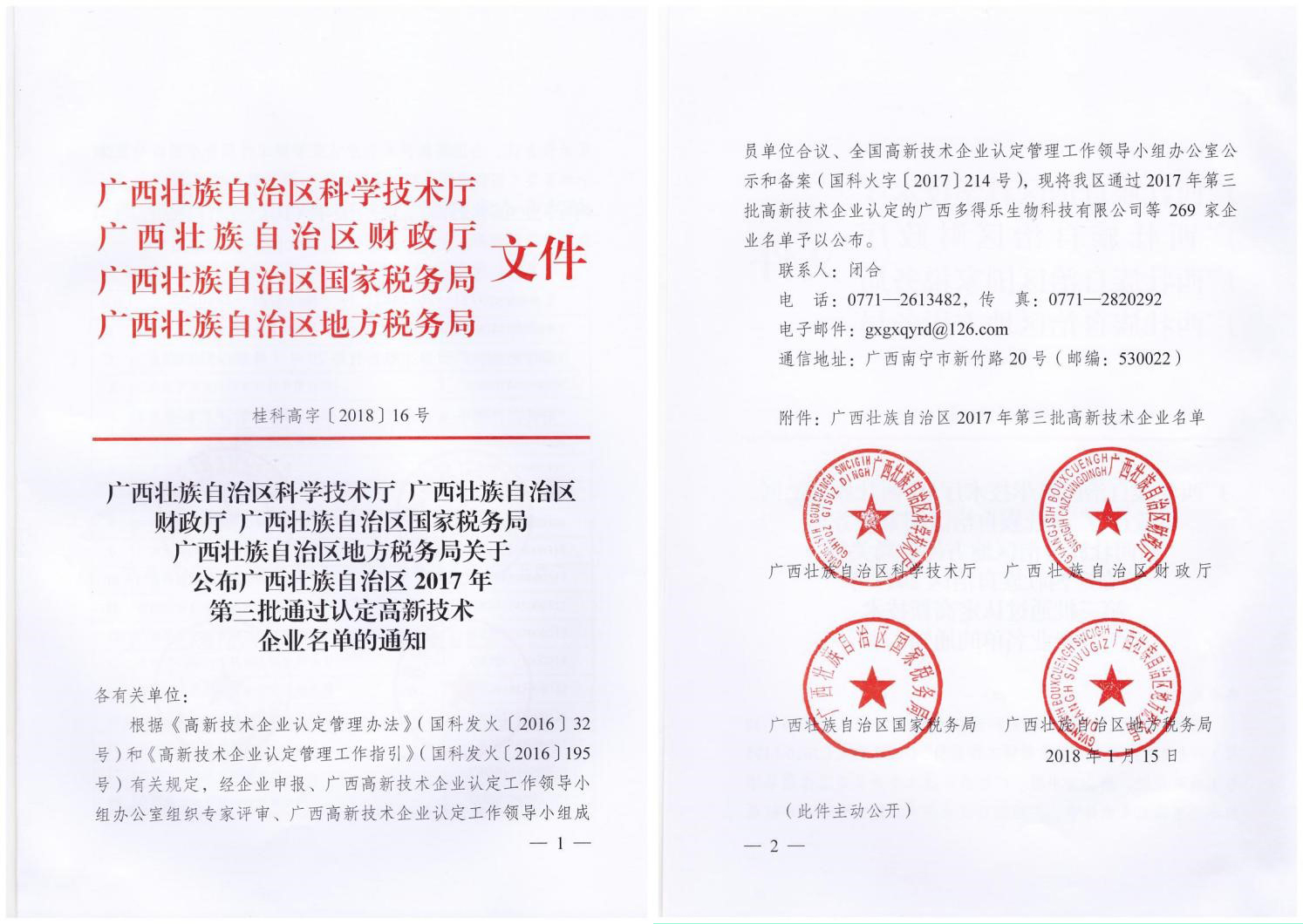 在辞旧迎新的2018年1月,从广西科技厅网站获悉,根据国家《高新技术企业认定管理办法》和《高新技术企业认定管理工作指引》的相关规定,经正科技被认定为国家级高新技术企业。1月29日,公司领取了由广西科技...