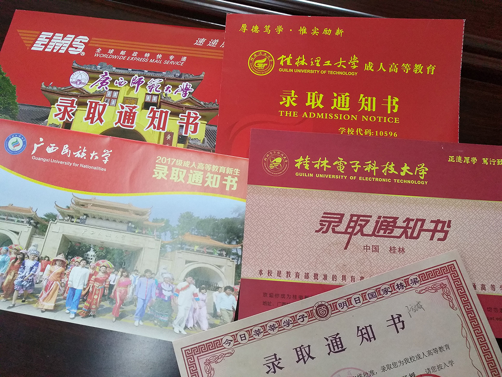 2017年12月25日,广西师范大学、广西民族大学、桂林理工大学、桂林电子科技大学、广西科技大学、等各个高校的录取通知书已经发放到学生手中。 图1 各高校录取通知书又是一年迎新季,又一批新生...