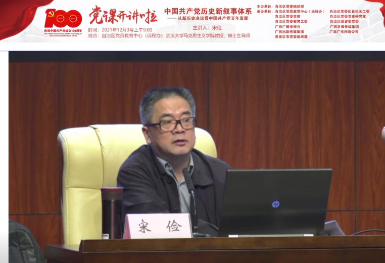 此次党课,以武汉大学马克思主义学院教授、博士生导师宋俭为主讲,课程围绕“新历史决议之‘新’”、“中国共产党历史新叙事体系的方法论、指导思想、编撰思路和需要处理好的四个关系”、“中国共产党历史新叙事体系的基本框架和书写方式”三个问题展开交流讨论。